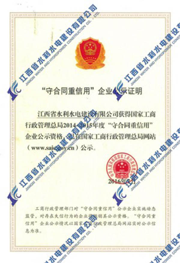 2016年我公司首次榮獲國家工商行政管理總局2014-2015年度“守合同重信用”企業公示資格?!笆睾贤匦庞谩惫净顒?,是工商部門依托合同行政監管職能組織開展的旨在推進企業信用建設的“守重”企業公示活動,是長期以來我國社會信用體系建設的重要組成部分。 誠信是企業經營發展的基石。公司堅守誠信理念,打造誠信品牌,通過不斷完善信用管理體系建設,規范信用行為,并結合多種形式的員工誠信教育活動,外樹形象,內強素質,取得了一定成績。