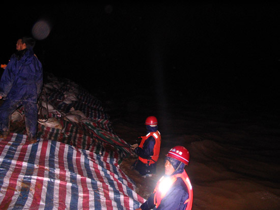 根據以往的施工經驗,我們很快啟動了搶險應急預案。但由于環境惡劣,考驗我們的時候到了,要發揚我們江西水建人“特別能吃苦、特別能戰斗、特別能忍耐、特別能協作精神”的時候到了,我們與洪水搶時間、爭進度,全體干群在漆黑的大堤上是一片穿梭奔跑的身影,大家齊心協力,手提肩扛,把一百多斤一塊的混凝土預制塊,一塊塊運到堤腳,此時項目部總工曾俊平不顧江水的寒冷,帶領其它幾名員工,奮身躍入水中,在水下鋪設彩條布,而此時水下溫度只有10℃左右,渾濁江水一浪高過一浪拍打在他們的身上。大家顧不上寒冷,顧不上疲勞,顧不上饑餓,衣服濕了又干,干了又濕,分不清是哪次被汗水還是雨水弄濕的,在微弱的手電光照亮下鋪設了一條又一條彩布條,碼起了一道又一道沙包小堤。經過大家的緊張奮戰,終于幾處險情得到了控制,等到我們在忙碌中回過神來時,已經是次日的凌晨三點多鐘,盡管大家拖著一副疲憊不堪的泥身子,但大家臉上裝滿了滿意和勝利的微笑,王總此時飽含真情地對大家說了一聲:“大家真的辛苦了,謝謝大家!”走在回家的路上,我正好與項目總工曾俊平走在一起,我看到他渾身濕漉漉的,我關心的問他在水中冷嗎?他笑笑說道:“這是關鍵時刻,再冷也要下”。他旁邊的同事告訴我,他是從下午三點鐘就一直在水里做事直到剛才,整整在水中浸泡了十二個小時。我們參加搶險的同志被曾俊平這種不怕困難、不畏艱險、不顧個人安危、敢于吃苦的精神深深感動著,真是我們學習的好榜樣!