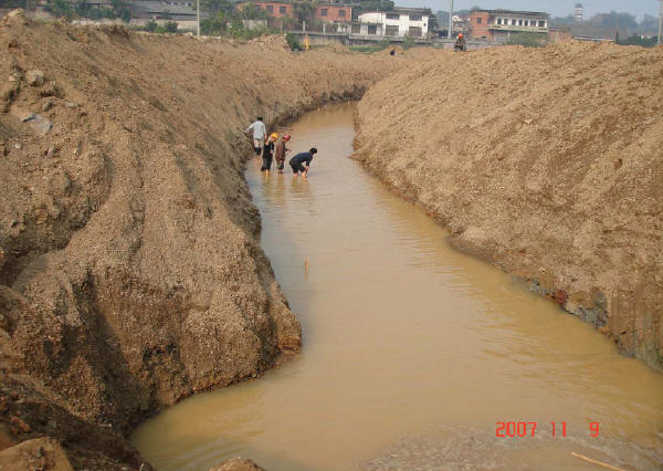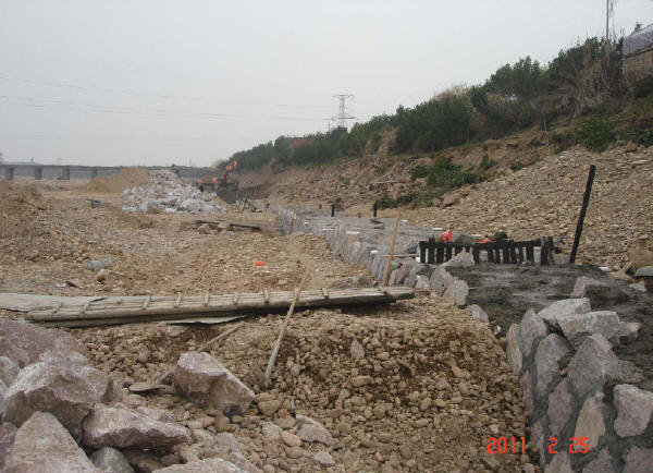 堤基清理:必須對堤內(nèi)、外坡腳線外1m范圍內(nèi)的亂石、墳?zāi)埂⒏鞣N建筑物和垃圾、雜草、樹木、樹根、腐植土及淤泥全部清除,并棄至背水坡腳以外或指定場地,水井、泉眼、洞穴等按設(shè)計要求處理,并經(jīng)驗(yàn)收確認(rèn)合格為止。