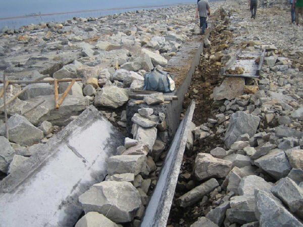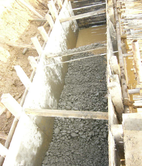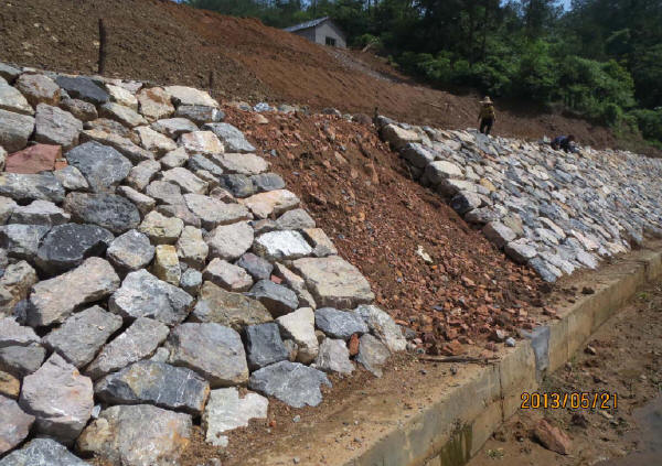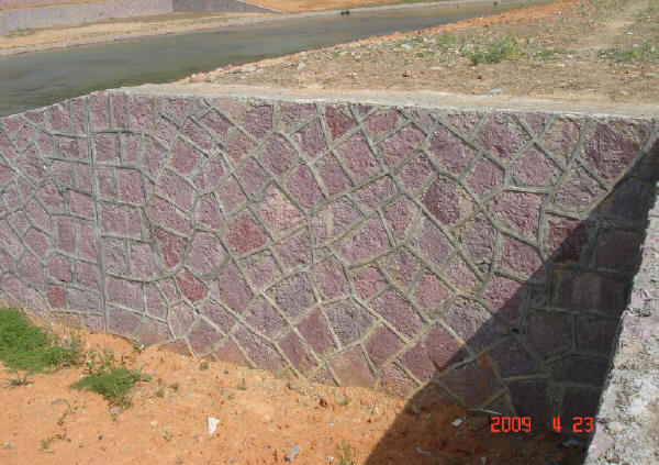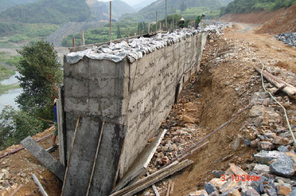 擋墻砌筑應(yīng)分層,每一砌筑層擺石時均應(yīng)座漿,隨鋪漿隨砌筑。嚴(yán)禁石塊大面無漿直接貼靠。混凝土必須用振搗器逐縫振搗。當(dāng)豎縫寬度在5cm以上時,可填漿后塞片石。嚴(yán)禁先堆砌石塊再用膠結(jié)料灌縫。