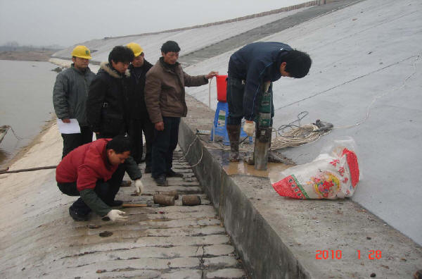 ※ 重點(diǎn)檢查水庫的險情是否已按設(shè)計要求給予消除;工程質(zhì)量是否按規(guī)定檢驗(yàn),各項檢測數(shù)據(jù)是否滿足設(shè)計要求或相關(guān)標(biāo)準(zhǔn):土方的壓實(shí)度、滲透系數(shù);混凝土(含預(yù)制塊)的抗壓強(qiáng)度、抗凍、抗?jié)B、彈性模量;砂漿的抗壓強(qiáng)度;灌漿的壓水試驗(yàn)結(jié)果(透水率Lu):固結(jié)灌漿≮5%、帷幕灌漿≮10%。